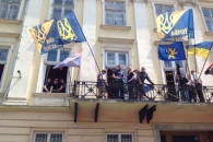 Активисты Национального Корпуса, вошедшие в сессионный зал Львовского областного совета, требуют принять закон об амнистии украинским добровольцам