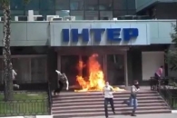 В Киеве на улице Дмитриевской, 30 перед входом в офис телеканала Интер неизвестные подожгли шины. Молодые люди в масках использовали зажигательную смесь.