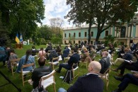 У входа на завод Антонов, в цеху которого в данный момент президент отвечает на вопросы СМИ, собрались активисты партии Демократична сокира.
