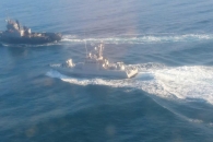 В сети появилось видео сближения корабля российских пограничников с судами ВМС Украины. На кадрах показано, как российский пограничный корабль атакует украинский буксир.