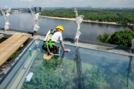 На новом пешеходном мосту, который соединяет арку Дружбы народов с Владимирской горкой, опять треснуло защитное стекло на обзорной части.