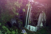 На полной скорости столкнулись автобус Mercedes с легковым автомобилем Opel. В результате ДТП автобус вылетел в кювет и перевернулся на правый бок.