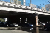 Как видно на обнародованных столичными водителями фото, с эстакады на нечетной стороне проспекта (в сторону центра Киева) отпадают большие куски бетона.