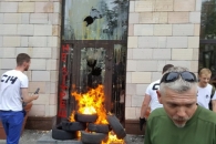 Патриотичные изображения появились на фасаде здания во время Революции Достоинства и оставались нетронутыми на протяжении 3,5 лет.