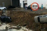 В Киеве на Борщаговке из-за проливных дождей 27 июля провалился грунт. В яму рухнули три автомобиля.