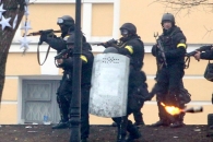 На кадрах видно, как люди с желтыми повязками и надписью "Беркут" на спине из автоматов, хладнокровно меняя магазины, ведут прицельную стрельбу на Институтской.