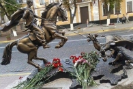 В Киеве на Владимирской, открыли памятник - Козак убивает двуглавого орла-мутанта.