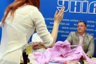 Активистка КУПР подарила Вадиму Колесниченко смирительную рубашку на пресс-конференции в защиту русского языка в украинской системе образования.