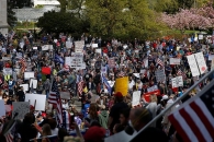 Митингующие выступают против указа губернатора-демократа Джея Инсли о карантинных ограничениях, обязывающих людей покидать работу, закрывать бизнес и "сидеть дома".