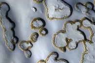 На Марсе наступила зима. Теперь на нем красуются удивительные снежные узоры, которые сумели снять астрономы. Толщина зимних ландшафтных шапок на планете может составлять от 1 м до 3,7 км.