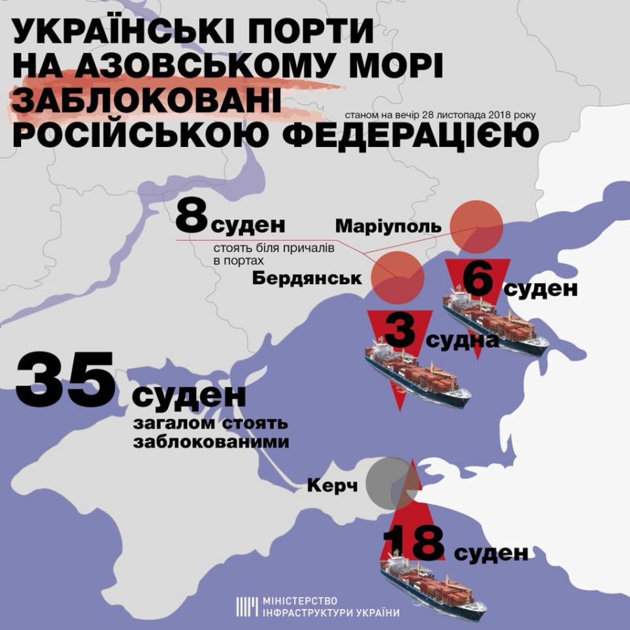 "На сегодня, по данным на вчерашний вечер, у нас 35 судов ожидают переход через Керченский пролив. Из них несколько ждут переход более 11 дней. Мы не можем оперировать в Азовское море военные силы.