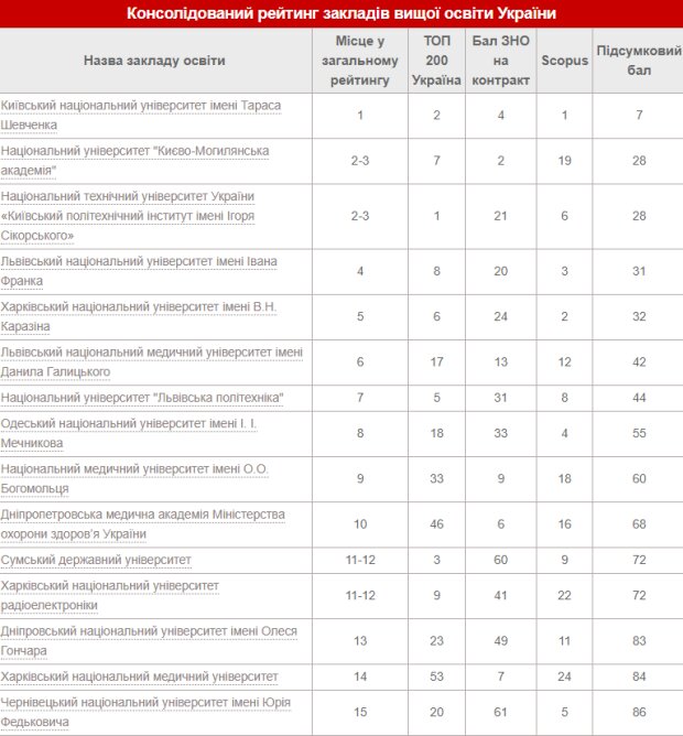 Первое место традиционно занял КНУ им. Шевченко, второе и третье место поделили КПИ им. Сикорского и «Киево-Могилянская академия». Четвертое место в рейтинге занял Львовский национальный университет им. Франко, а пятое - Харьковский национальный университет им. Каразина.