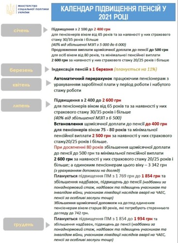 Продолжение выплаты ежемесячной доплаты к пенсии до 500 грн для лиц в возрасте от 80 лет и минимальной пенсионной выплаты 2600 грн при наличии у них страхового стажа 20/25 лет и больше.