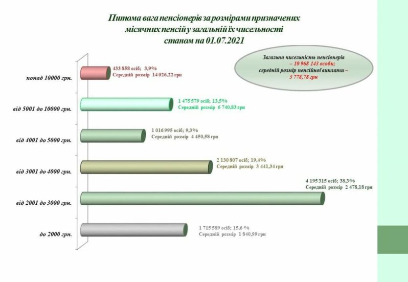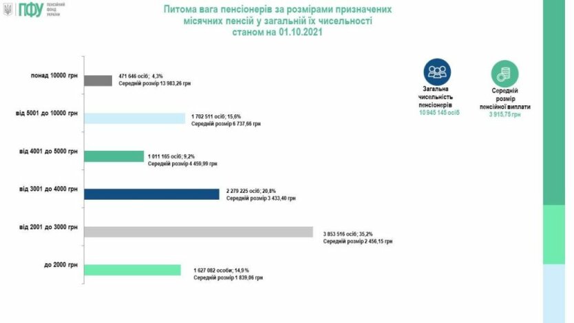 - от 2001 до 3000 грн - 35,2% (3 853 516 человек), средняя пенсия - 2 456,15 грн,