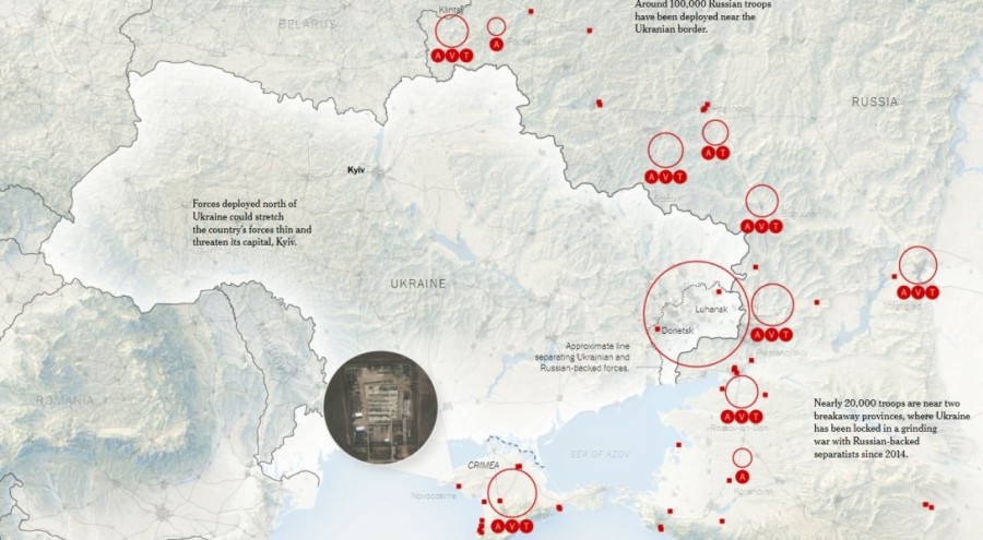 Россия разместила на границе с Украиной минимум 8 крупных групп, которые окружили страну с трех сторон и могут вторгнуться уже в январе. The New York Times опубликовало карту с расположением российских войск, основываясь на данных официальных лиц, аналитиков и спутниковых снимках.