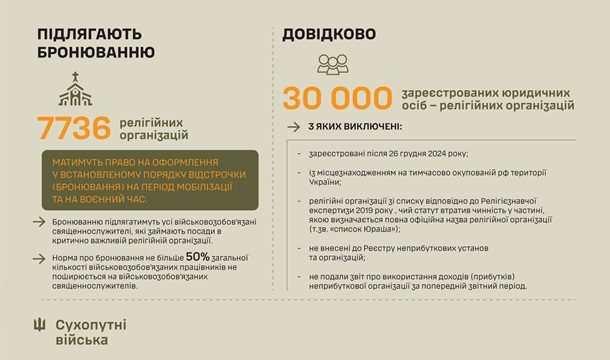 За даними Сухопутних військ, лише 7736 релігійних організацій матимуть право на бронювання 100% священників. Усього в Україні 30 тисяч організацій.