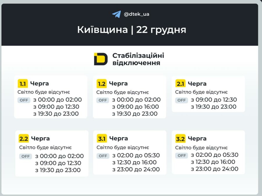 ВІЙНА В Україні Київська область: оновлені графіки відключень електроенергії на 22 грудня