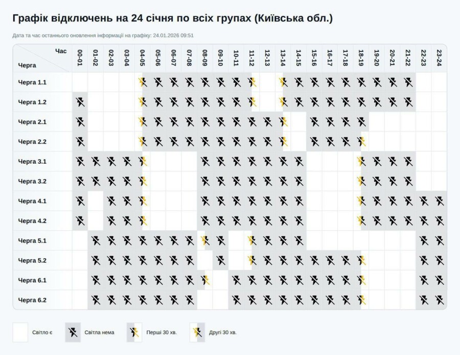 На Київщині протягом дня задіяно одразу дві-три черги відключень. Це означає, що населенню доведеться провести значну частину доби без світла.