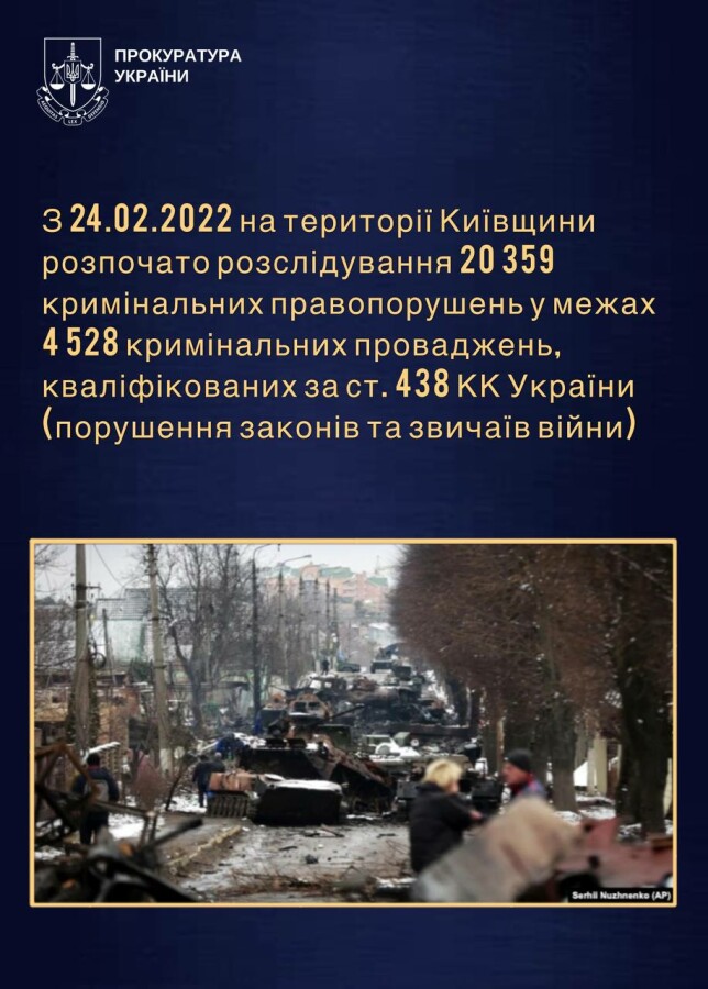 З 24.02.2022 на території Київщини розпочато розслідування 20 359 кримінальних правопорушень у межах 4 528 кримінальних проваджень, кваліфікованих за ст. 438 КК України (порушення законів та звичаїв війни).