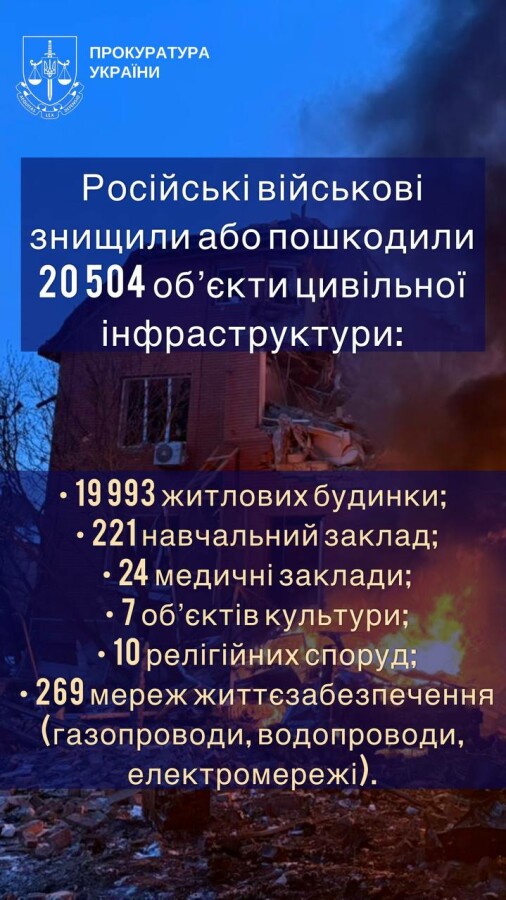 Російські військові знищили або пошкодили 20 504 об’єкти цивільної інфраструктури, з них:
