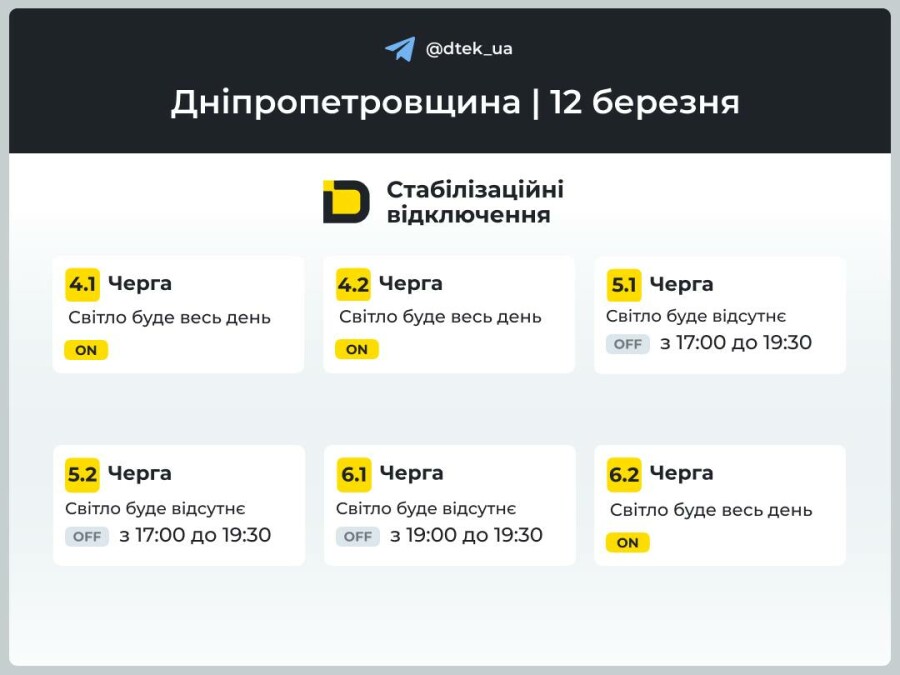 ВІЙНА В Україні Дніпро та Дніпропетровська область: графік погодинних відключень світла на 12 березня