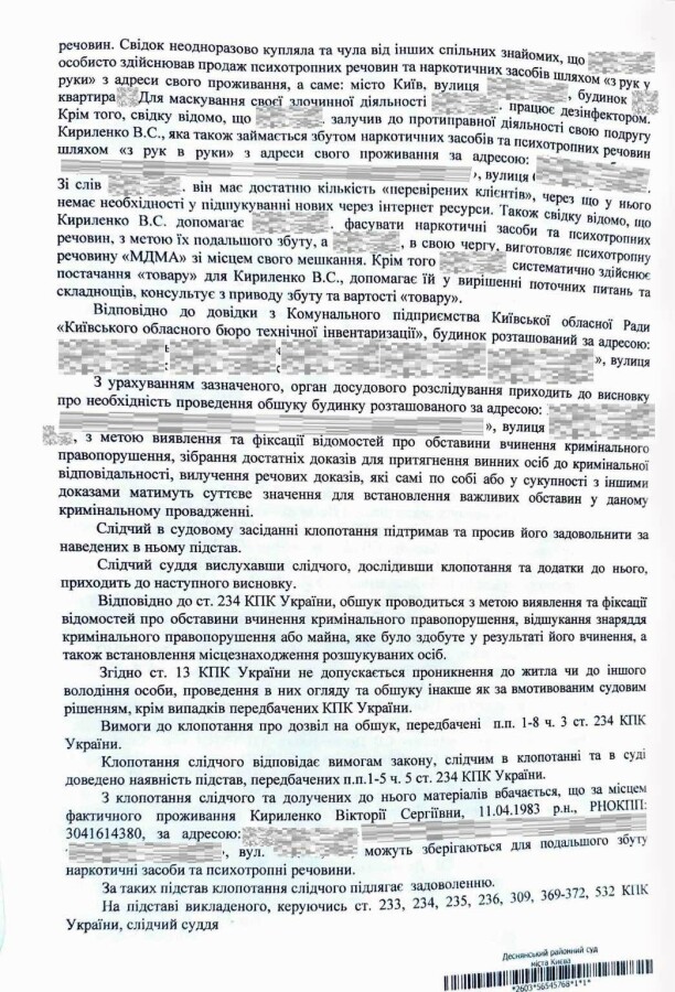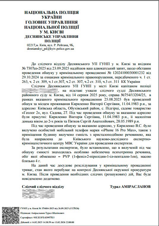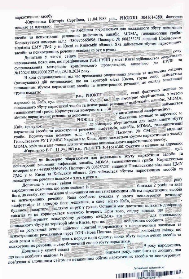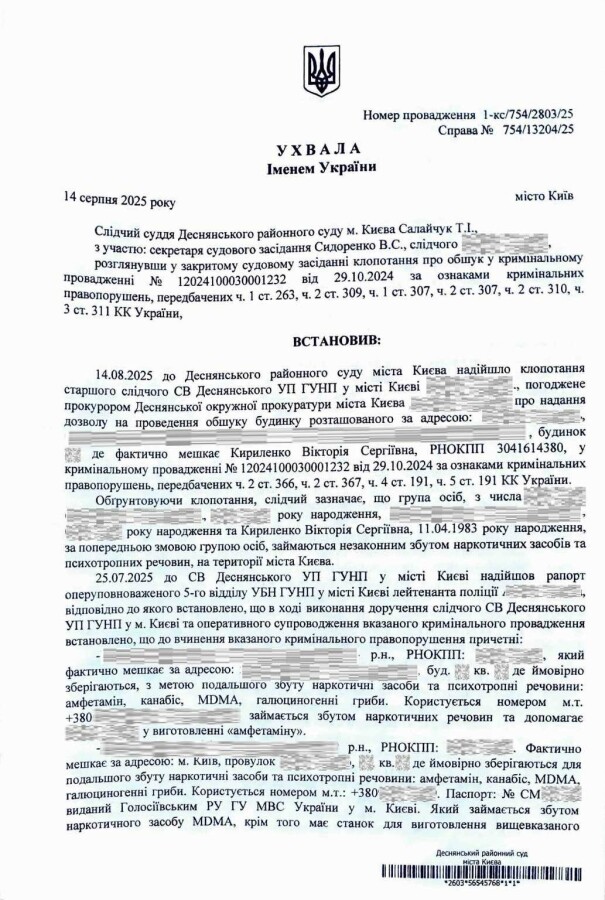 Також було встановлено, що разом із фігуранткою та малолітньою дитиною проживав громадянин Сергій П’ятков, який у 2023 році був засуджений за ч. 2 ст. 305 та ч. 2 ст. 309 КК України (контрабанда та зберігання наркотичних засобів, справа № 758/13046/19). За даними слідства, його зв’язок із Кириленко Вікторією може свідчити про можливе залучення останньої до незаконної діяльності. Слідство також розглядало версію використання образу матері з дитиною для конспірації протиправної діяльності в сфері наркоторговлі.